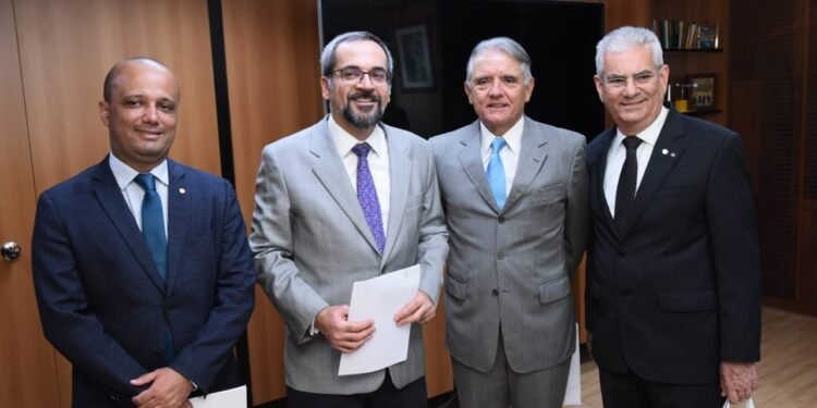 O líder do Governo na Câmara dos Deputados, Major Vitor Hugo (PSL-GO), pediu nesta terça-feira (3/9) ao ministro da Educação, Abraham Weintraub, a elaboração de um estudo técnico sobre a viabilidade da abertura de 10 vagas, no campus de Cristalina, para o curso de Agronomia do Instituto Federal Goiano. Vitor Hugo foi ao ministério acompanhado do prefeito de Cristalina, Daniel Sabino Vaz; do reitor do instituto, Vicente Pereira; do diretor do campus de Cristalina, Eduardo Vasconcelos; e do reitor do Centro Universitário de Anápolis – UniEvangélica, Carlos Hassel Mendes.