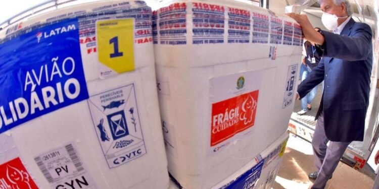 Unidades são todas do consórcio Oxford/AstraZeneca, produzidas pela Fundação Oswaldo Cruz. Governador Ronaldo Caiado espera terminar imunização de idosos com 60 anos ou mais e avançar na proteção de pessoas com comorbidades, deficiência permanente, grávidas e puérperas. Estado recebe, na madrugada desta terça-feira (04/05), primeira leva de imunizantes da Pfizer/BioNTech, um total de 17.550 doses