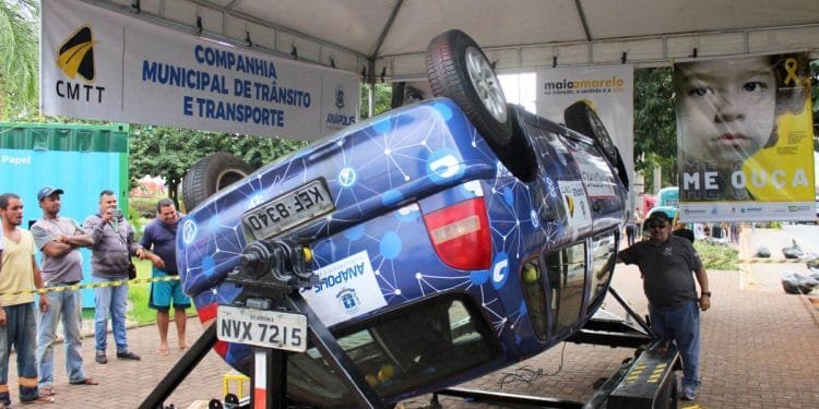 Todos de ponta cabeça. Foi assim o dia um da campanha Maio Amarelo, em Anápolis, na última quinta-feira (2). No interior do simulador de capotagem, cidadãos tiveram a oportunidade de experimentar a experiência que ninguém quer passar no dia a dia, que é um acidente de carro.